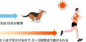 しかし、他の動物、たとえば犬などは、真夏にマラソンと同じスピードで走ると、15分くらいしかもちません。