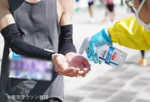 参加者・ボランティアの方と一緒に取り組むことを大切にし、大会事前には携帯用の消毒スプレー2万7500名分を配布した他、衛生に関する情報面でもサポート。大会当日は、社員29名のボランティアが、フィニッシュエリアでの手指消毒にあたり、9名がランナーとして走行中の衛生チェックを行いました。また、コース上にある本社には救護所を設置、フィニッシュエリアにはビオレuのパウダールームカーを設けて手洗いの場を提供しました。