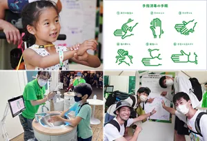 動画で正しい手洗い方法を見ながら、実際に延べ1万人以上の方にご利用いただきました。さらに、飲食ゾーンや物販コーナーなど、手洗いが出来ない場面には、消毒液と正しい使い方が簡単に分かるようパネルを設置しました。