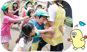 日焼け対策をしたから、太陽の下で思いっきり遊べるね! 保育園の授業がきっかけで、おうちでも日やけ止めを塗る習慣がつくといいな! 日焼け対策の秘訣は笑顔の秘訣にもなってるんだ!