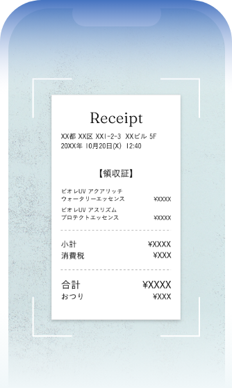 - クレジットカードをご利用のお客様は、必ずお客様個人情報が印字されている部分を切り離すか、折りたたんで、お買い上げ情報が明記されたレシート部分のみを撮影してください。