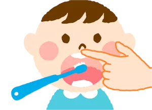 子どもをあお向けに寝かせて頭をひざの上にのせ、あごを手でおさえながら上からのぞきこむようにしてみがきます。
