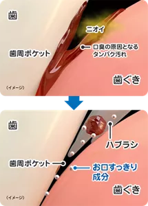 原因菌を殺菌して、口臭・歯肉炎を防ぎます。