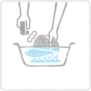 ザルに帽子をかぶせた状態で、使用量の目安に合った洗剤を溶かした水に浸します。