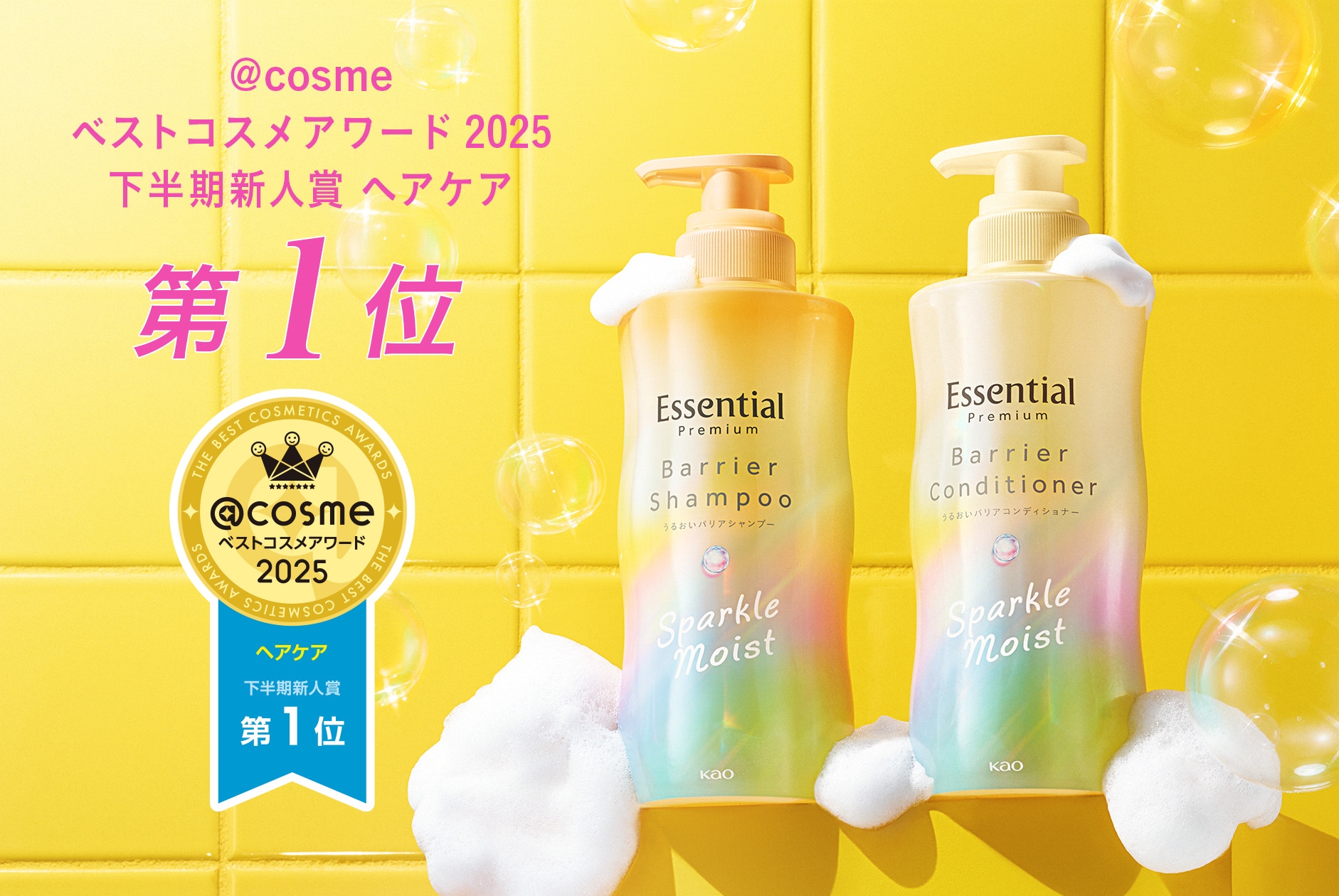 「@cosmeベストコスメアワード2025」にて「Essential Premium バリアシャンプー&コンディショナー スパークルモイスト」が「下半期ヘアケア新人賞1位」を受賞!