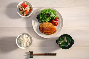 照り焼きハンバーグ/小松菜としめじのスープ/焼き野菜のさっぱりマリネ/麦ごはん