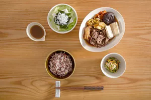 白菜たっぷり牛すき煮/豆腐としらすのサラダ/オクラと湯葉の和え物/十五穀米ごはん