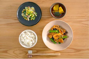 さばのキムチ炒め/チンゲン菜の和え物/かぼちゃの煮物/麦ごはん