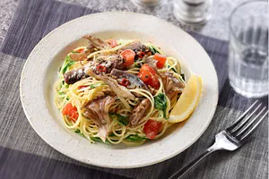 味付けいわし缶を常備して、いつでも簡単に「スマート和食」のペペロンチーノ。 オメガ3がしっかり摂れて、おいしい