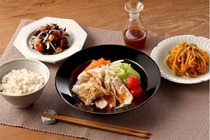 簡単!肉も野菜も一緒に蒸すだけ。副菜は、食物繊維豊富なひじき、豆類、切干大根をデリ風仕上げで、たっぷりと。