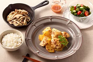鶏むね肉をジューシーに仕上げるコツは 小麦粉をまぶして焼くこと。 食物繊維豊富なきのこと海藻を添えて。