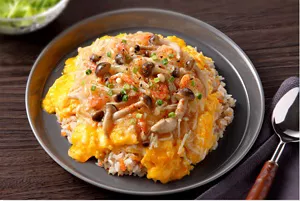 一品で、タンパク質、食物繊維がしっかり摂れる「スマート和食®」のオムライス。きのこおろしあんをかけて、おいしさと食物繊維をアップ!