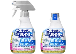 A.緑色の「キッチン泡ハイター」と同様です。除菌*1・消臭なら2分、漂白・ヌメリ除去なら5分放置して、水で流すだけ!*2