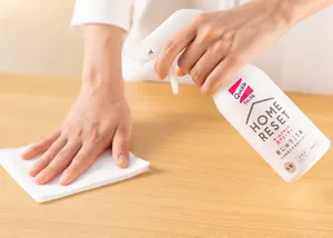 子供の食べこぼしなどでベタついたテーブルにクイックルホームリセットを吹きかけて、拭きとるだけでスッキリ。