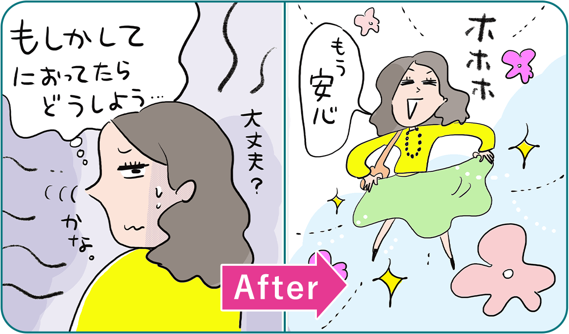 ちょいモレ対策におりものシートを使っていましたが、それだと対応しきれずに、尿が染み出てしまうことが何度かありました。尿のニオイも気なるので、外出時は香り付きシートを使用しましたが、やっぱり不安。思いきって吸水ナプキンに変えてみたら、ちょいモレの瞬間に吸収してくれて安心!なによりもニオイがきにならないことが一番うれしかったです。
