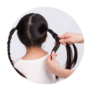 結び目に好きなヘアアクセをつけたら、三つ編みツインテールのできあがり♪