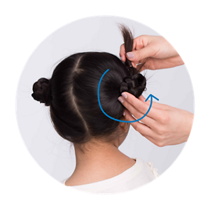 さらに、両サイドの三つ編みを結び目にまきつけて、ピンで固定します。