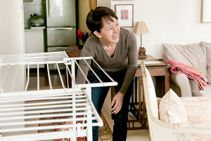 洗濯物は、乾燥機ではなくリビングに大型物干し台をサッと広げて室内干し