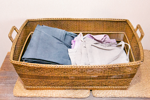 アイロンがけを待つ洗濯物は、タイ旅行で一目ぼれした竹細工の籠の中に一時保管