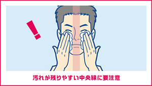 右の図をご覧ください。なんの変哲もない洗顔ポーズですが、この状態で両手を上下に動かすと・・・顔の中央が洗えていません!洗ったつもりでも意外と肌に汚れが残りやすいのが、顔の中央線(おでこや鼻)。これが洗顔の盲点なのです!しかも、そこは毛穴が多くニキビのできやすい場所。洗顔するときは「顔の中央線」を意識しましょう!