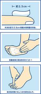 ① 適量を少量ずつ手に取ろう。使用量の目安は、 片方の足で2.5cm程度!