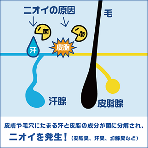 日常生活で感じている方も多いと思いますが、男性は女性と比べて、皮脂(アブラ)が多く、汗をかく量も多いので、もともとニオイやすい肌環境にあるのです。30代の男性は女性に比べて、皮脂の量が多く、汗の量はなんと約3倍!
