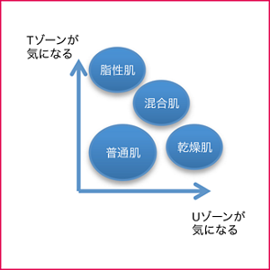 アナタがもし、普段からTゾーンにアブラを感じるなら、脂性肌。Uゾーンにカサつきを感じるなら、乾燥肌です。 またTゾーン、Uゾーンどちらも気になる方は混合肌。逆にどちらもそんなに気にならない方は普通肌といっていいでしょう。 スキンケアアイテムはこのような肌タイプや使い心地、仕上がり感の好みによって設計されていますので、まずは自分の肌タイプを知って、自分に合ったものをみつけましょう。
