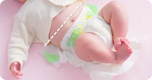 内側のギャザーの中に指を入れてギャザーが倒れないようにしながらおむつをおへその上まで引き上げます。すっぽりつつみこむようにあててください。男の子は、おちんちんを下に向けてください。