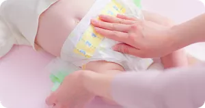 おむつの端を押さえながらテープをかるくひっぱりとめます。