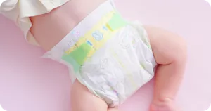 赤ちゃんのおしりをそっと持ち上げて汚れたおむつを引きぬきます。