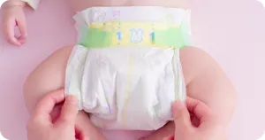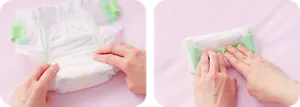 取り替える前のおむつの下に敷きます。新しいおむつの上端が、おへその上にくるくらい奥まで深く差し込むようにしてください。
