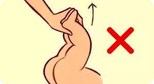 赤ちゃんの脚は、M字型になっているのが自然です。動かすからといって、無理に引っぱったりすると脱臼する危険性があります。脚を持つ時は、そっとやさしく、関節の動きを妨げないようにしてください。バタバタ動かす時は、ヒザの間に手を入れて脚を持ち、胸の上の方まで押し上げるようにしてください。つっぱる時は、赤ちゃんに話しかけたりして力を抜いてあげましょう。足の裏に手をあて、おなかの方に押し上げるようにしてヒザを折ると、自然なM字になります。