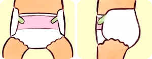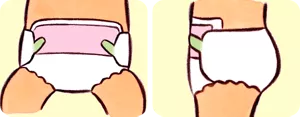 抱っこしたり座らせたりした時に、おなかはぴったりなのに背中だけすき間があくことがあります。テープをななめ下に向けて、軽く引っぱるようにとめると背中がきゅっとしまりフィットします。