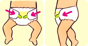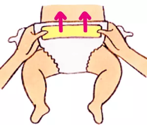 テープタイプのおむつは、 赤ちゃんの体型にあわせて ある程度調整できるようになっています。 フィットするように、 テープの位置を工夫してあててみましょう。