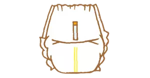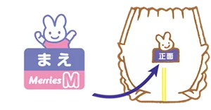パンツタイプの紙おむつは、おなか側には「まえ」という表示、背中側にはおむつを捨てるときに使うテープがついています。逆にはかせないように確認しておきましょう。