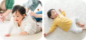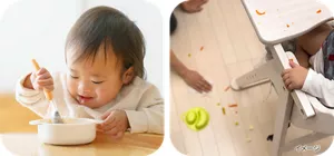 乳幼児は、運動機能が未発達なため手指や口を上手に使えず、よく食べこぼしをしてしまいます。また、好奇心旺盛なため食べ物を口に運ばず、つかんだり、投げたりして感触を確かめようとしてしまいます。どれも成長には必要な行動です。見守りながらなるべく掃除が楽になるよう対策をたてましょう。