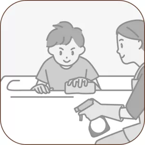 お食事用のエプロンの使用、テーブルやイスの下にはシートや新聞紙を敷くことで食べこぼした後の片づけがスムーズになります。また、テーブルとイスの周囲にものを置かないようにすることで、食べ物を振り回したり、こぼしたりしたときのお掃除が比較的楽になります。