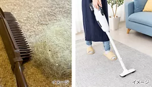 抜け毛はラグなどの布の繊維に絡まると、掃除機では取りにくくなります。ゴム手袋やエチケットブラシなどでやさしくなでると、効率的に毛が集まって取り除きやすくなります。そのあと掃除機などで細かい汚れを取り除きます。