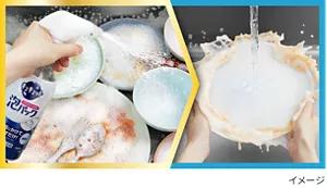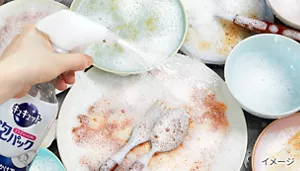 食べ終わった食器をキッチンのシンクに下げたついでに、「ゴシゴシいらずの食器用洗剤」で効率的にサッとかけて洗い流すだけで、食器洗いが完了します。