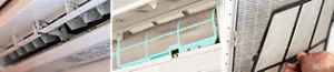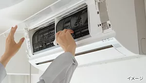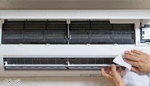 フィルターを外して、フィルターにたまったホコリを掃除機などで取り除きます。中性洗剤をつけた布で汚れを拭き取ります。汚れがひどいときは、水洗いした後、陰干ししてください。