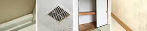高湿度、換気不足。浴室の床・壁・目地のカビ。押し入れなどの収納のカビ。
