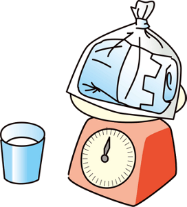 紙コップなどを利用して計ります。おむつを使用している場合は、使用後のおむつの重さを計り、そこから使用前のおむつの重さを引いて算出してください。