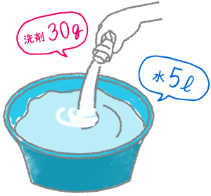 水・ぬるま湯に洗剤を溶かします (ぬるま湯は30℃程度がおすすめです) ※水5Lに対し、洗剤30g