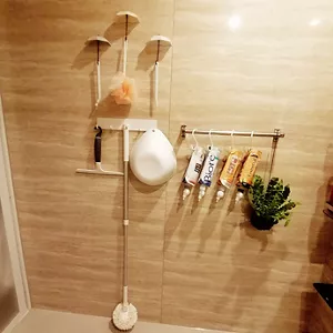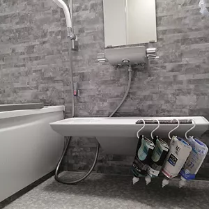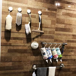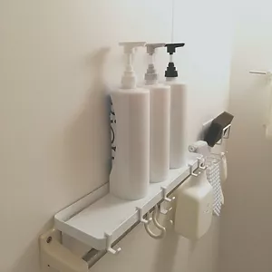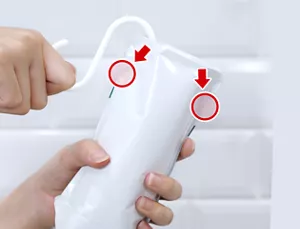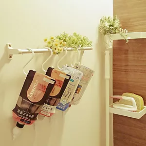 いずれかの穴にフックの先端を差し込み、浴室内のタオル掛けなどにつりさげてご使用ください。