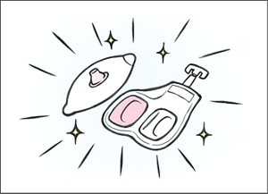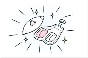 ある日、歯科治療で使われる歯型を取るゼリーをヒントに、おへその中に流しこんで固めてへそごまをとる方法を発案。多くの試作や使用テストのプロセスを経て、現在のへそごまパックの形ができあがっていきました。パック剤の量や固まるスピードにもこだわり、2液をまぜるゼリーポーションやおへそシール、スポッとへそごまをとる方法はどれも花王が独自に開発した技術です。